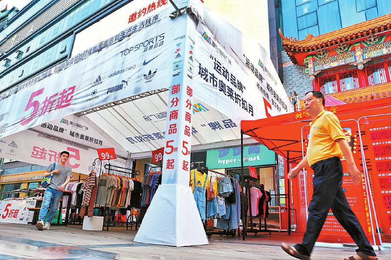 6月15日,泸州市江阳区摩尔国际广场门口,多个知名品牌搭起了卖货帐篷,吸引来往群众前来挑选。周梦颖摄